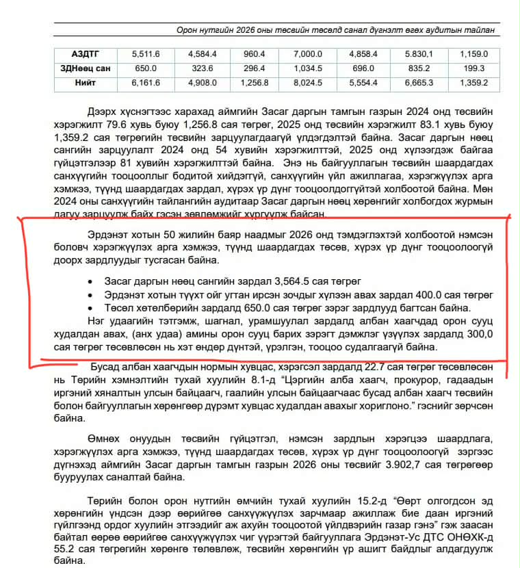 Гэвч төрийн аудитаас аймгийн Засаг даргын нөөц сангийн (3.56 тэрбум), зочин хүлээн авах зардал 400 сая, төсөл, хөтөлбөрийн (650 сая) төгрөгийг төлөвлөсөнг “ХЭРЭГЖҮҮЛЭХ АРГА ХЭМЖЭЭ, ШААРДАГДАХ ТӨСӨВ, ХҮРЭХ ҮР ДҮНГ ТООЦООЛООГҮЙ”-г анхааруулжээ.